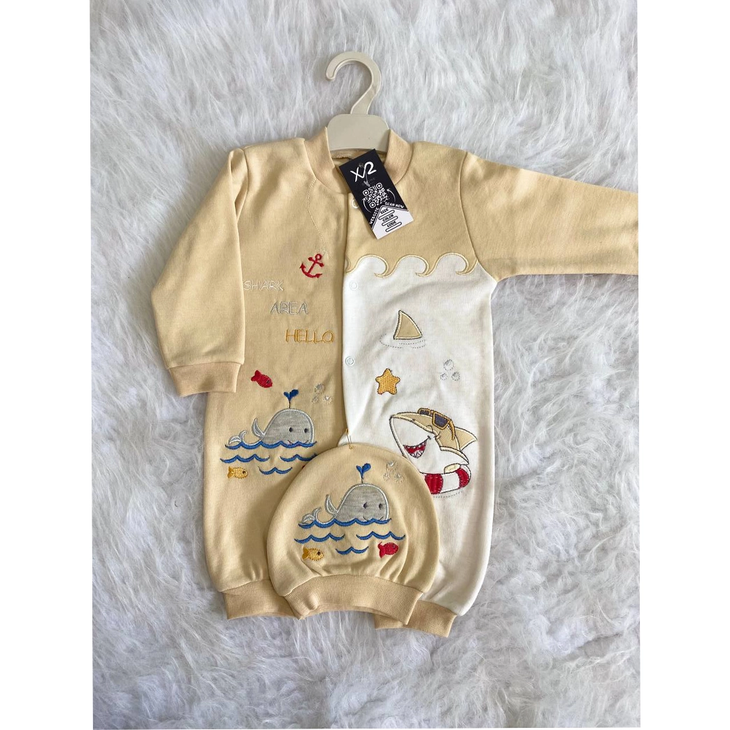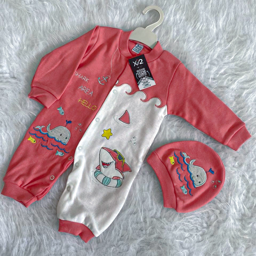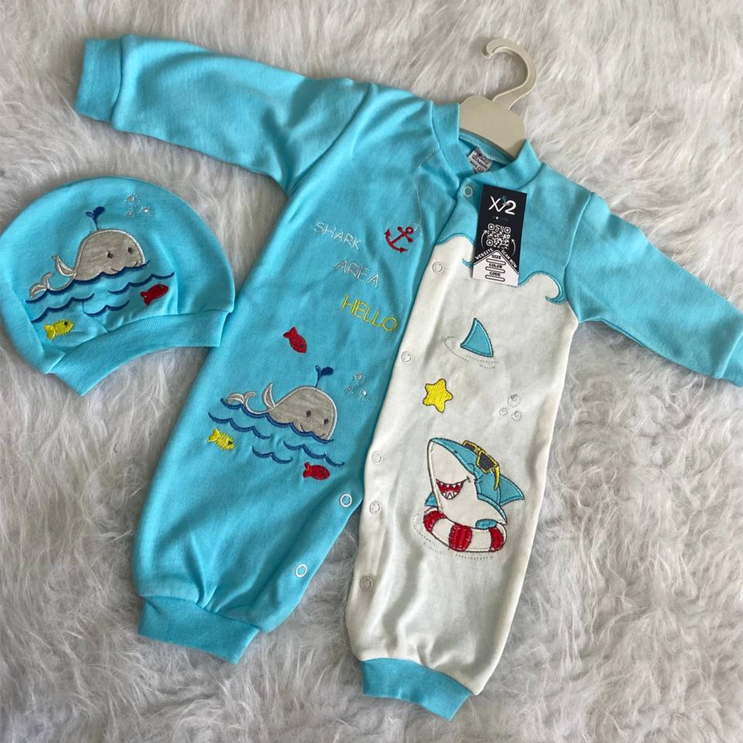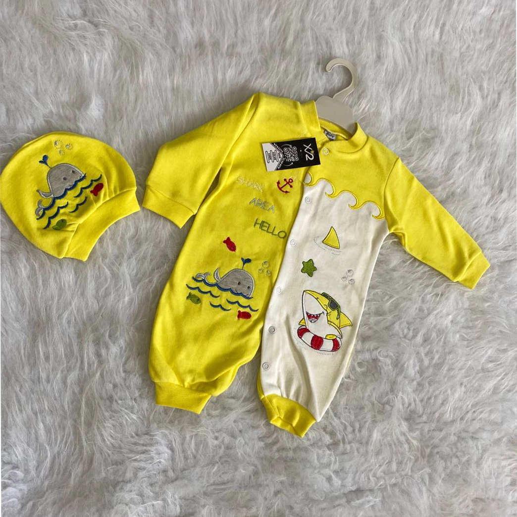 اكتشف سالوبت أطفال مواليد قطني 100% بتصميم قرش وحوت مطرز! دلل صغيرك بلمسة من المرح والجودة مع هذا السالوبيت المريح، المثالي من عمر يوم حتى 6 شهور. يتميز برسومات القرش والحوت الجذابة والمطرزة بدقة عالية لإضفاء مظهر مميز ومتانة تدوم طويلاً. متوفر بألوان بيبي بلو، أصفر، بيج، وأحمر مبهجة. يأتي هذا السالوبيت مواليد الرائع مع طقية أنيقة لإكمال إطلالة طفلك. مصنوع من القطن الناعم واللطيف على بشرة الأطفال الحساسة. اجعل طفلك يتميز بأسلوب بحري ساحر مع لمسة التطريز الأنيقة!